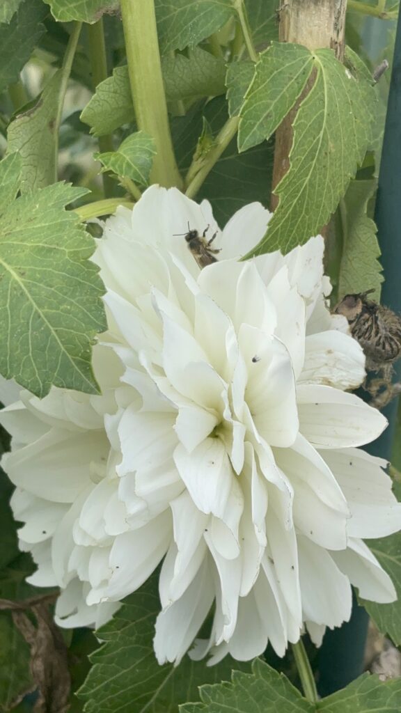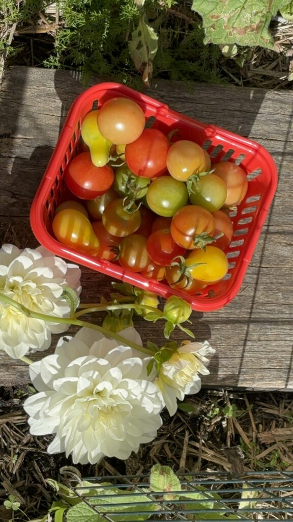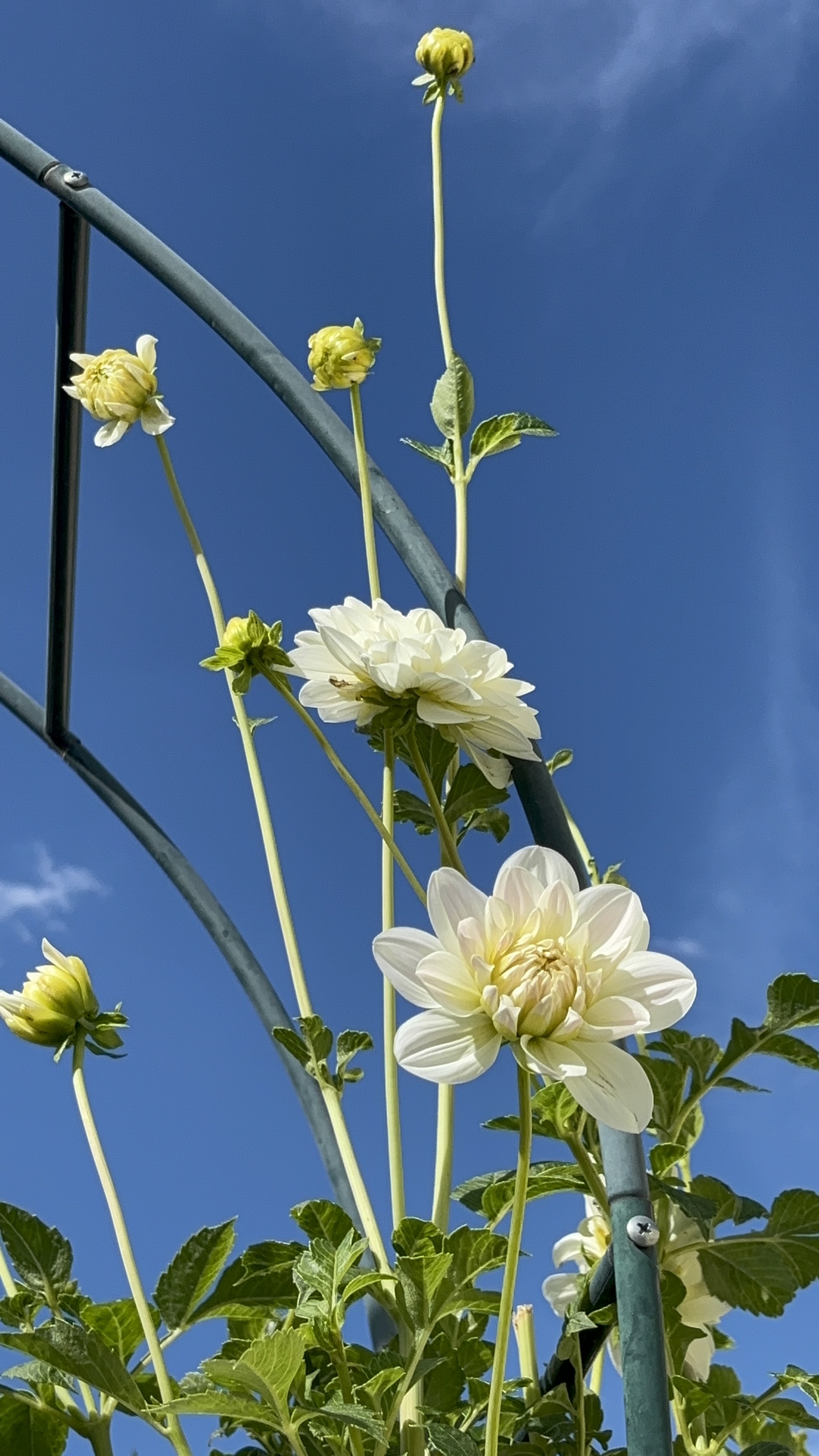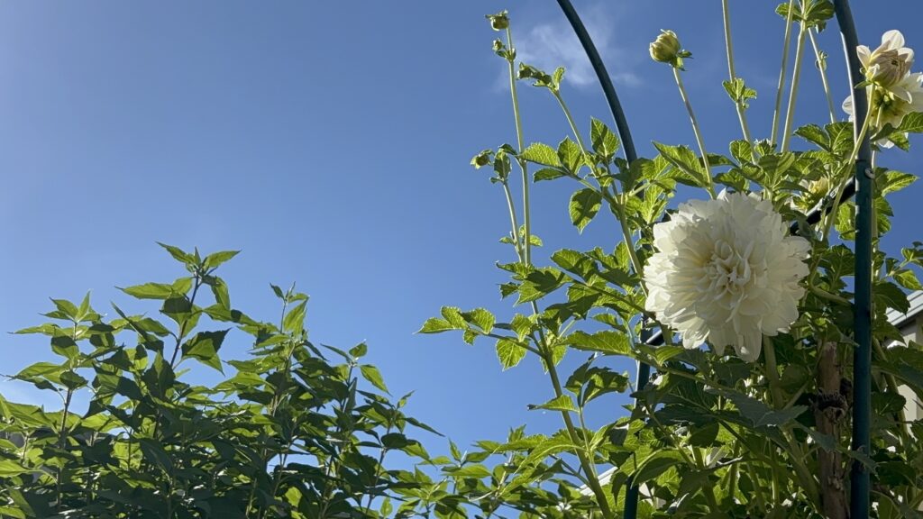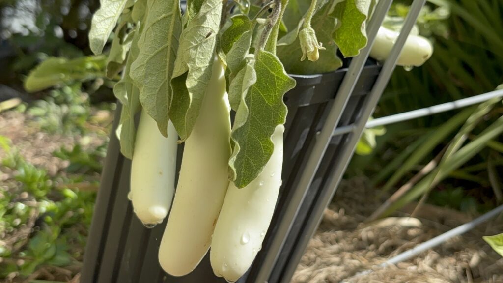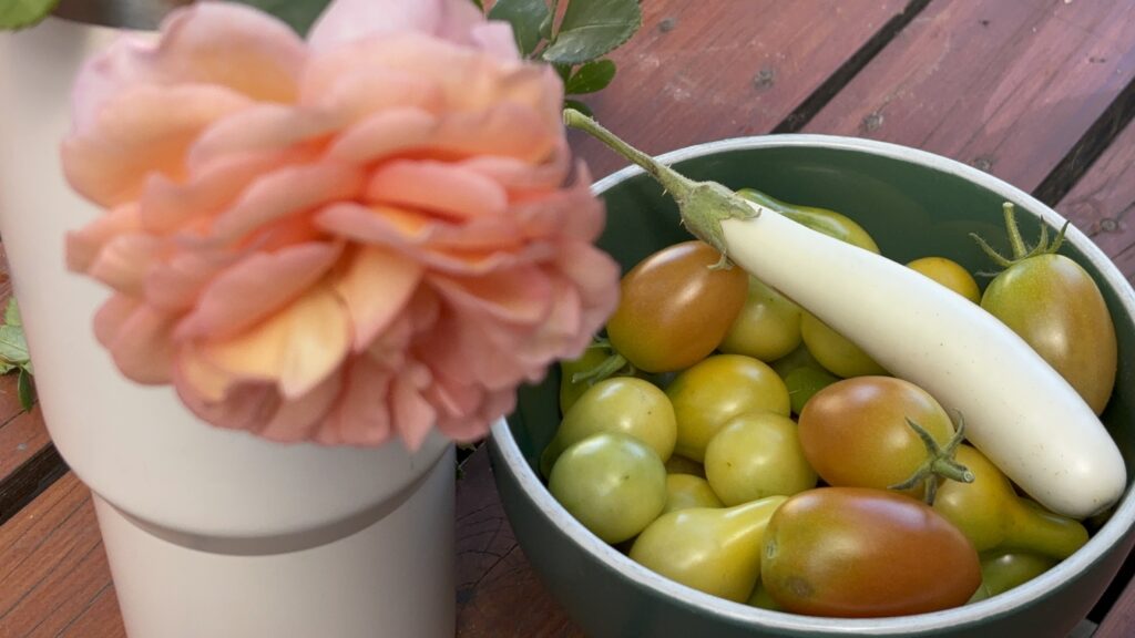 The grape harvest has come to an end, with plenty to share, though the vine is still lush and green for now. Tomatoes are still slowly ripening as the plants begin to fade, while the finger eggplant has finished flowering/fruiting and has been moved into the greenhouse to overwinter for another season. The garden is still full of colour, with white dahlias, daisies, and soft pink David Austin roses in bloom.