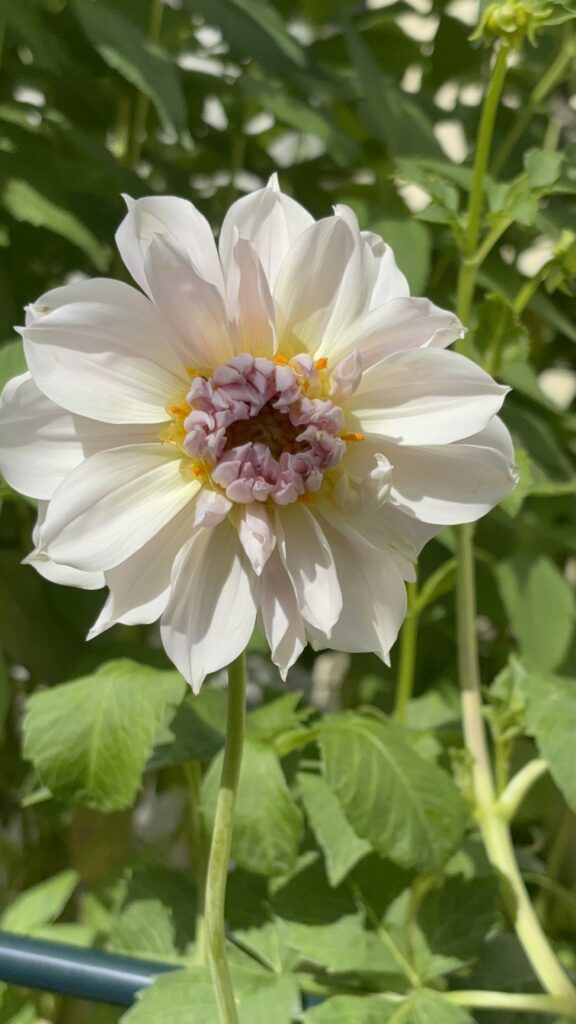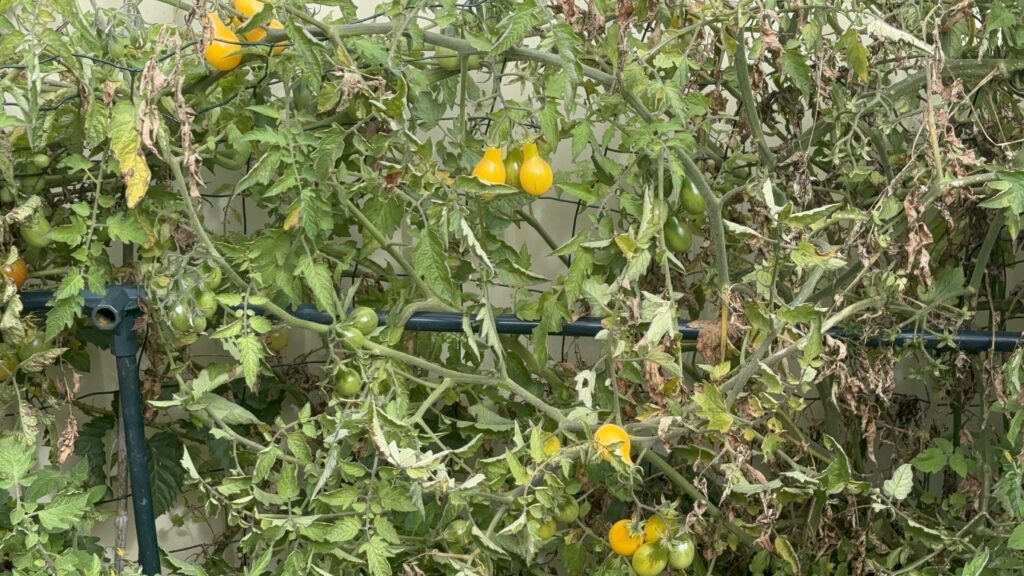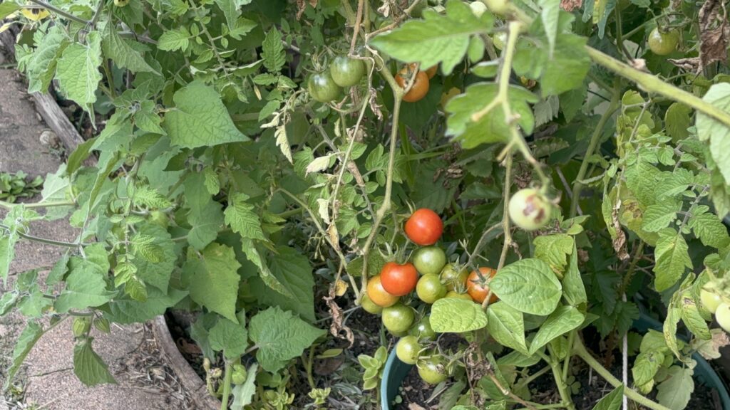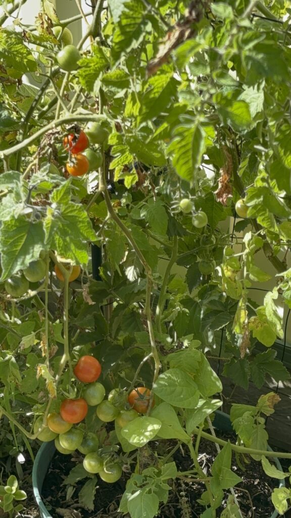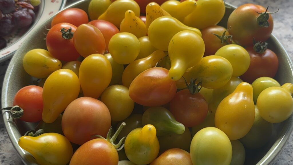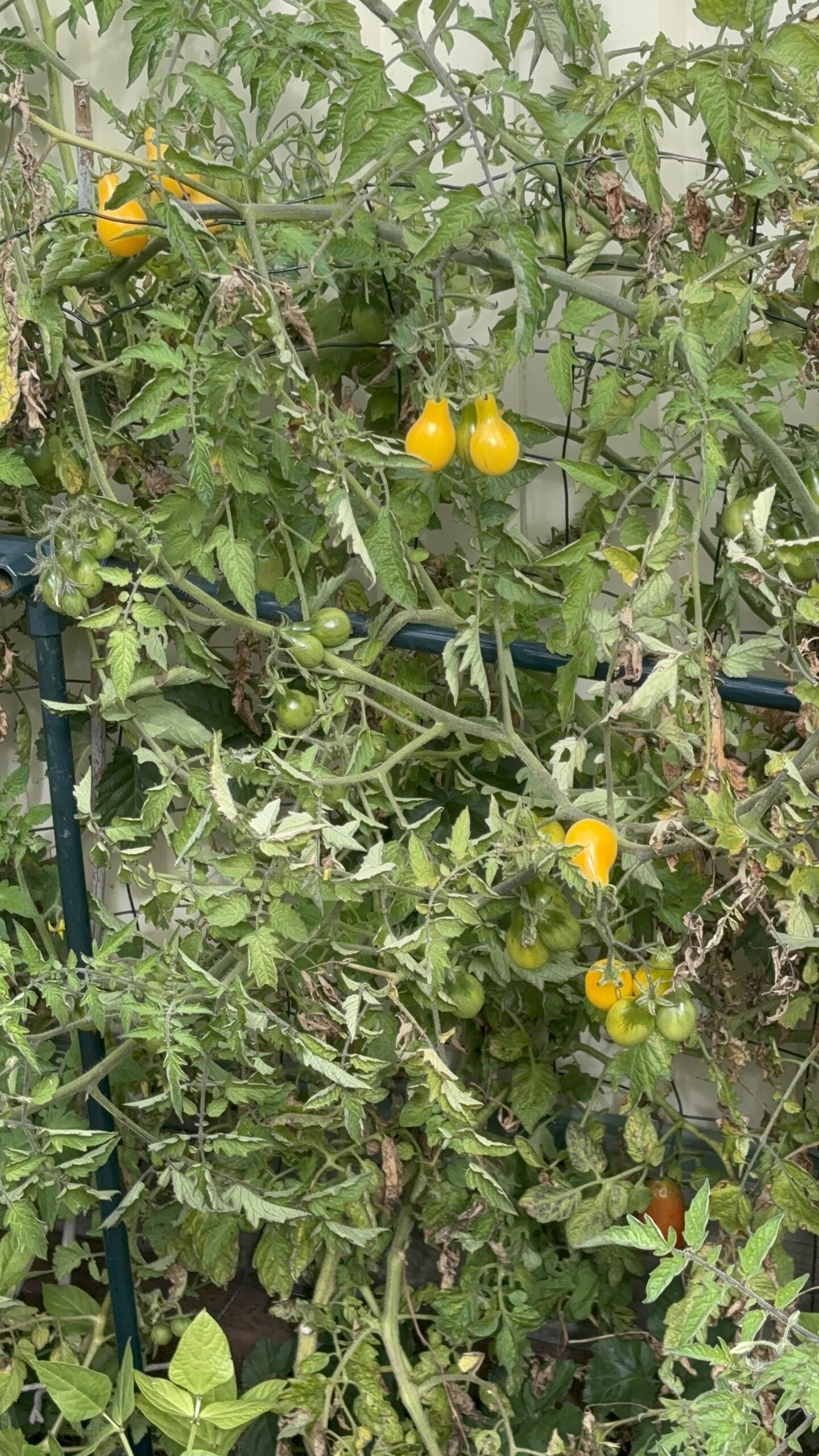 The grape harvest has come to an end, with plenty to share, though the vine is still lush and green for now. Tomatoes are still slowly ripening as the plants begin to fade, while the finger eggplant has finished flowering/fruiting and has been moved into the greenhouse to overwinter for another season. The garden is still full of colour, with white dahlias, daisies, and soft pink David Austin roses in bloom.